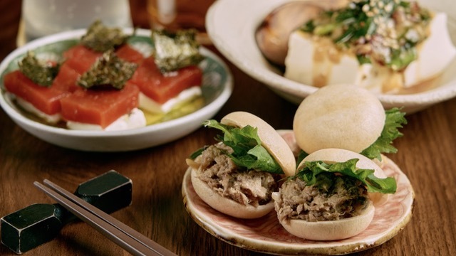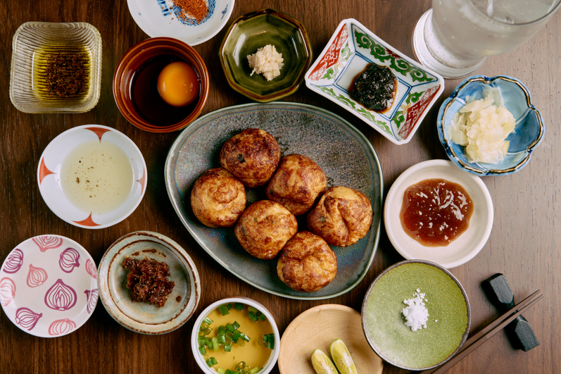 Takoyaki are a popular Japanese street food with bits of Octopus inside hot grilled balls (dumplings) topped with savory garnishes and sauces